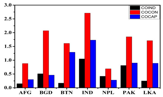 Figure 5 presents the carbon emission index per unit of energy consumption (COCON), carbon emission index (COIND) and per capita carbon emission (COCAP) score of all selected countries. It can be seen that India has the highest carbon emission index per unit of energy consumption score with 2.71 and Nepal shows the lowest score of 0.69 among all the selected countries. Also, it is fascinating that these countries rely on external suppliers with increased carbon emissions trends, which is opposite to the primary energy self-sufficiency score.