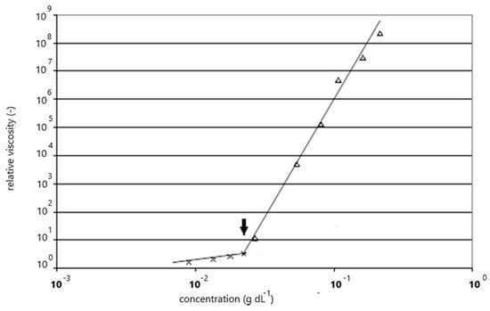 Measurements of the concentration dependence on viscosity for Carbomer A are shown in Figure 1. The relative viscosity profile forms two distinct regions, where at low concentrations below 2.1 × 10−2 g dL−1, the polymer behaves as an isolated chain, whereas above this value, polymer–polymer interactions are evident. The viscosity is relative to an arbitrary shear rate of 10−6 s−1. We have previously shown that the shear rate dependence of solutions above 2.1 × 10−2 g dL−1 can be modelled using a modified form of the reptation model [1].