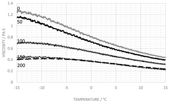 To explore the effects of the addition of calcium ions, measurements were performed in which the concentration of calcium ions was increased. Figure 4 illustrates that an increase in calcium ion concentration produces a decrease in the viscosity of the fluid. This is the result of divalent cations forming a bridge between neighboring carboxylic acid groups and thus promoting a gel formation. Dilution with 200 mg L−1 calcium ions lowers the viscosity from 0.81 to 0.39 Pa∙s at 0 °C, and from 1.27 to 0.40 Pa∙s at −15 °C. The viscosity level at this dilution changed insignificantly across the temperature range, which can be considered to be a desirable property. The general viscosity level, however, is considerably lower compared to the parent fluid and would be considered insufficient as a useful de-icing medium.