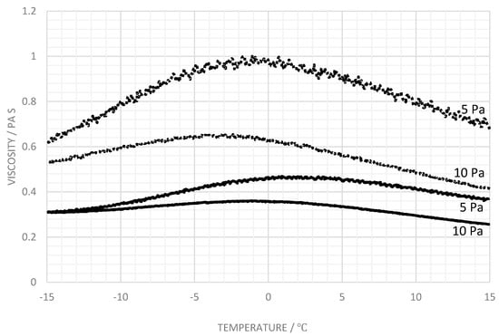 A shear stress-controlled Carri-Med CSL2 500 rheometer (TA Instruments, Crawley, UK) using a 4 cm diameter parallel plate fitted with a solvent trap was used for the viscosity measurements. The temperature was maintained using a Peltier effect controller combined with an anti-freezing bath maintained at 0 °C, enabling temperatures between 15 and −15 °C to be achieved. For the experiments in which the temperature was decreased, a cooling rate of 1.0 °C per two minutes from 15 to −15 °C was used, followed by heating up to a temperature of 15 °C. Measurements were performed at shear stresses of 5 and 10 Pa. All tests were repeated and found to provide excellent reproducibility. Tests for thixotropy using stress sweeps were outside the scope of this study, since the purpose of de-icing fluids is to adhere to a surface and have the ability to be removed at the point of take-off.