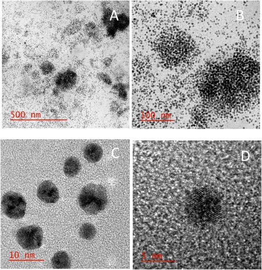 High resolution transmission electron microscopy (HRTEM) images of small, monodispersed Fe3O4 nanoparticles (NPs) as contrast agents in diphenyl ether observed under different magnifications. Reprinted under a Creative Commons Attribution 4.0 International License from Reference [13] from journal MethodsX.