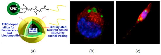 Trifunctional nanomaterial SPIO@SiO2(FITC)-BDA and its application as an axonal tracer. (a) Schematic representation of the axon tracer design showing a superparamagnetic iron oxide (SPIO) core, a middle layer of Fluorescein isothiocyanate (FITC)-doped silica, and the external layer of biotinylated dextran amine (BDA). Fluorescent confocal micrographs of (b) undifferentiated and (c) differentiated N2a cells that have taken up SPIO@SiO2(FITC)-BDA nanoparticles. Reprinted with permission from Reference [25].