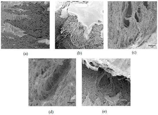 Scanning electron microscopy images of three-dimensional printed fibrin scaffolds crosslinked with different concentrations of genipin: (a) 0 μM, (b) 1 μM, (c) 2.5 μM, (d) 5 μM, and (e) 10 μM. Reprinted under a Creative Commons Attribution 4.0 International License from Reference [61] from the journal Scientific Reports.