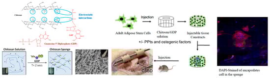 - Mekhail, M.; Daoud, J.; Almazan, G.; Tabrizian, M. Rapid, Guanosine 5′-Diphosphate-Induced, Gelation of Chitosan Sponges as Novel Injectable Scaffolds for Soft Tissue Engineering and Drug Delivery Applications. J. Adv. Healthc. Mater. 2013, 2, 1126–1130. [Google Scholar] [CrossRef]