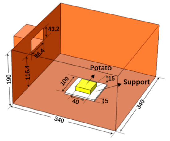 The simulation model consists of a WR340 waveguide and a multimode cavity, as shown in Figure 1. Microwaves are fed through the WR340 waveguide with the dimension of 86.4 mm × 43.2 mm. The heated object is a rectangular parallelepiped potato that is placed on the center of the Teflon bracket on the central bottom of the cavity. The model structure is built in a multi-physics software, COMSOL Multiphysics (5.3a, COMSOL Inc., Stockholm, Sweden).