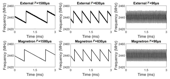 By analyzing the equivalent circuit model of the magnetron, it can be known that there is an equivalent distributed inductance and capacitance, so the magnetron frequency may not keep up with the fast change of the frequency of the external signal. The frequency-time relationship between the magnetron and the externally injected signal was measured by a real-time spectrum analyzer (RTSA). The measurement results are shown in Figure 4. One Panasonic CW magnetron 2M244-M1 is applied in the system to provide high power microwave. A DDY10-5K/0V8-S220/F02 DC power supply from Sichuan Injet Electric Co. Ltd. (Deyang, China) is used to provide high voltage direct current to the magnetron. The external injection signal is provided by a solid-state source. The first row gives a plot of the frequency of the external injection signal over time, and the second row gives a plot of the frequency of the magnetron output signal over time, which is obtained using the frequency time analysis function of the real-time spectrum analyzer. It can be seen that the magnetron output and the external signal are consistent when the sweep period is from 1580 us to 90 us. The injection lock time is negligible here.