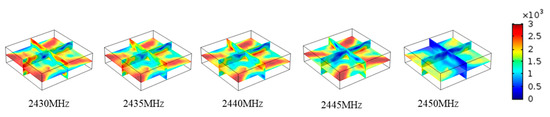 It can be seen from the simulation results that the sweep frequency heating can effectively improve the uniformity of heating. However, in the eight sets of simulations, a set of sweep heating resulted in poorer uniformity than fixed-frequency heating, as shown in Table 7. It may be because that the heated load constant matches better with the electromagnetic wave transmission line at 2.45 GHz. Therefore, better energy absorption is obtained. It may be concluded that sweep frequency heating can increase the uniformity of heating in most cases, and the best heating performance needs to be discussed in a practical situation.