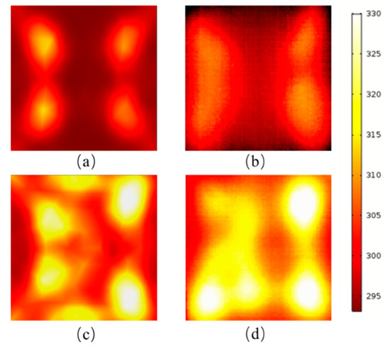 Experiment and simulation results of pear surface temperature distribution (unit: K): (a) Simulated heating results of the fixed frequency heating; (b) experimental heating results of the fixed frequency heating; (c) simulated heating results of the sweep frequency heating; and (d) experimental heating results of the sweep frequency heating.