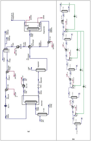 A 4-stage compression system is employed to increase the pressure of the produced CO2 up to 6865 kPa [33]. Figure 1 shows the simulation of (a) the CO2 separation plant and (b) the compression sector to produce the high-purity CO2 stream.