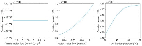 Variation of reboiler energy requirements (kW) versus (a) the make-up of amine molar flow (kmol/h), (b) water make-up (kmol/h), and (c) the recycled methyldiethanolamine (MDEA) temperature (°C).