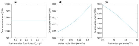 Variation of condenser energy requirement (kW) versus (a) the make-up of amine molar flow (kmol/h), (b) water make-up (kmol/h), and (c) the recycled MDEA temperature (°C).