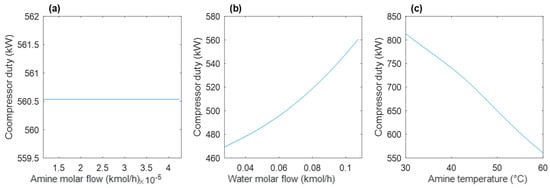 Variation of compressor power demand (kW) versus (a) the make-up of amine molar flow (kmol/h), (b) water make-up (kmol/h), and (c) the recycled MDEA temperature (°C).