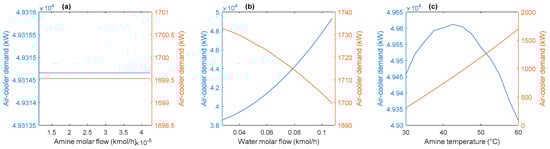 Variation of air-coolers energy demand (kW) versus (a) the make-up of amine molar flow (kmol/h), (b) water make-up (kmol/h), and (c) the recycled MDEA temperature (°C). Blue: cooling system of the recycled amine; orange: cooling system of the sweet natural gas.
