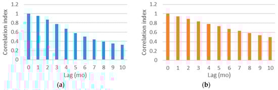 A structural auto regression model is applied to separately autocorrelate both West Texas Intermediate (WTI) crude oil and US natural gas prices [42]. For both potential candidates, we analyze monthly quotations from July, 2007 to July, 2017 (the last available date). To correlate the historical values of the quotations, we use a similar methodology as the one used by Zhou et al. [43] regarding the coefficients of the Pearson equation (Equation (1)). Pearson coefficients (PCs) measure the strength and direction of the linear relationship between two random variables [44]. In this case, both variables represent the monthly quotations of the RC, but differ in one period: