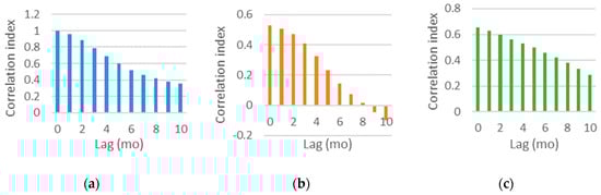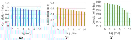 where denotes the PC for a particular period. is the covariance of the quotations () with respect to one-period of the previous quotations (), and is the squared of the standard deviation. varies from –1 to 1 and, in general, the higher the correlation coefficient, the stronger the relationship is [45]. Dancey and Reidy [46] state that if ranges from 0.7 to 0.9, the strength of correlation is high, and quite enough to determine the size of the correlation. This characteristic can be visualized when plotting the coefficient versus the time lag between the quotations.