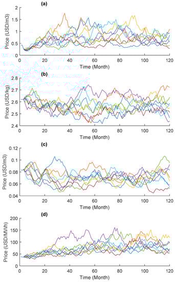 Random price trajectories, for (a) NG expressed, (b) MDEA, (c) CO2, and (d) EE.