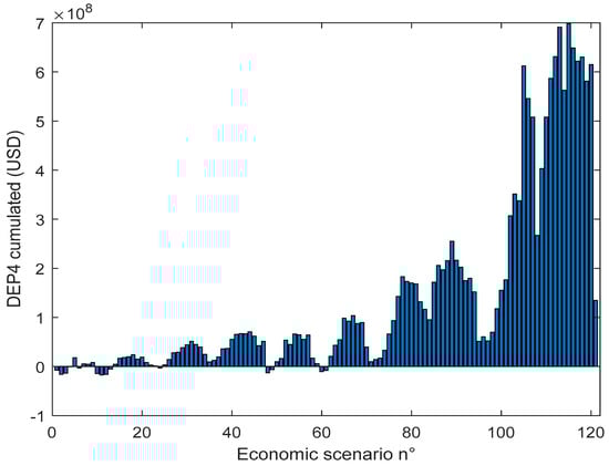 Figure 10 shows, on the y-axis, the value of the cumulated DEP4 (USD), and on the x-axis it shows the time series of market quotations. Each bar represents the value of the DEP4 calculated by considering the market quotations of the corresponding month based on the specific plant configuration that maximizes the DEP4 value.