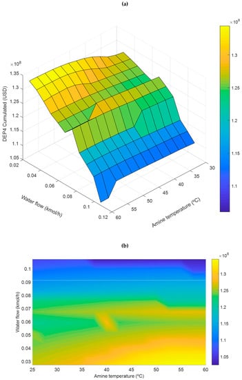 (a,b). Average cumulated DEP4 (USD) function with respect to water amine molar flow rate (kmol/h) and recycle MDEA temperature (°C), based on the PCD method.