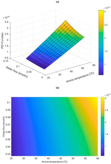 (a,b). PEI function with respect to water amine molar flow rate (kmol/h) and recycle MDEA temperature (°C), based on Waste Reduction.