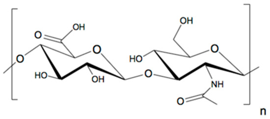 Hyaluronan (HA) structure with repeating units of glucuronic acid (left) and N acetyl glucosamine (right) connected as beta (1–3) glucuronide and beta (1–4) glucosaminidic bonds.
