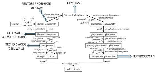 Currently, HA is being produced industrially using microbial sources. The general pathway for microbial HA biosynthesis is illustrated in Figure 2. Native producers like Streptococci group A and C that synthesizes this polymer as part of their cell capsule have been largely explored for HA production [4,5,6,7]. More recently, many recombinant platforms like Bacillus subtilis [8], Lactococcus lactis [9,10], Corynebacterium glutamicum [11,12], Escherichia coli [13], Agrobacterium sp. [14] and Pischia pastoris [15] are being constructed for HA production, to overcome pathogenicity issues associated with the native producers [16]. However, it is noteworthy that only one of these recombinant systems (Bacillus subtilis) has been scaled up for commercial production [17]. Widespread application of recombinant cell factories for HA production has been primarily impeded by poor yields and low molecular weight of HA, that compares poorly with those from native Streptococci.