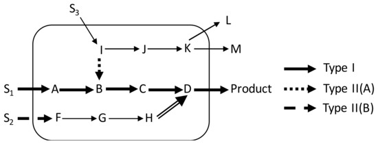 Categories of over-expression targets in the product sub-network of a model cell: S1, S2 and S3 are taken up by the cell and contribute to the production of the product in different ways. Type I targets (bold solid arrows) from the traditional biosynthetic pathway; Type II(A) targets (dotted arrow) can be overexpressed to add a bias at the branch point metabolite associated with it. Type II(B) targets (double compound arrow) can be traced out from contributors (dashed arrow) that are parts of a linear path.