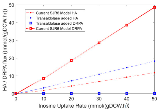 Simulations showing an increase in the slope of the HA flux from inosine in the current model. Red data points represent flux values from the current model, while blue data points represent values from the model with transaldolase knock-in. One can observe the increase in the slope of HA flux with inosine flux upon transaldolase knock-in (blue dashed line) compared to that in the current model (red dashed line). The square markers represent 2-deoxyribose-5-phosphate aldolase (DRPA) reaction when transaldolase is present.