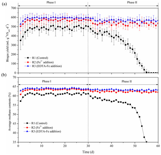 All reactors were operated at OLRs of 2.5 (Phase I) and 5.0 (Phase II) gVSadd·L−1·d−1 for 30 days, respectively. The KWs were fed and discharged once a day. During the AD process, appropriate inoculated sludge was added into the reactors to compensate for the loss of anaerobic sludge. All reactors were sampled every day to measure VFA and biogas production. Enzyme activities, including those of F420 and F430, were determined every five days. The samples were collected on the 30th and 60th days of the experiment to analyze the Fe fraction.