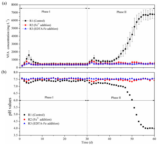 It is well known that VFA accumulation is one of most important factors limiting methane production from KWs [12,13]. It can be seen from Figure 2, the VFA concentration and pH values in R1–R3 were all in the ranges 300–550 mg·L−1 and 7.2–7.6 on the Phase I, respectively. The pH and OLR provided suitable conditions for the growth and metabolism of anaerobic microorganisms, which promoted the conversion of the VFAs to methane. When the OLR increased to 5.0 gVSadd·L−1·d−1 (Phase II), the changes in VFAs and the pH in R2 and R3 were significantly different from those in R1. For instance, on the Phase II, the VFA concentration in R1 increased rapidly from an average of 528.9 to 6788.9 mg·L−1, corresponding to a pH decrease from 7.36 to 4.01. Nevertheless, no obvious VFA accumulation and pH reduction occurred in R2 and R3, and the AD performance of R3 with EDTA-Fe addition was slightly higher than that of R2 with Fe2+ addition. This result suggests that the addition of Fe2+ effectively prevented the acidification of KWs at a high OLR. It has been reported that the addition of Fe2+ accelerates the process of anaerobic fermentation and provides a more suitable metabolic environment for microorganisms in anaerobic digestion systems [27]. Moreover, the addition of EDTA-Fe has been proven to be more effective than Fe2+, and Hu [29] and Zhang [17] have also obtained similar conclusions using other chelating agents, such as nitrilotriacetic acid (NTA) and EDDS.