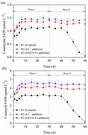 As we know, enzymes play a very important role in the metabolism of methanogenesis; simultaneously, trace elements provide active potentials for the synthesis of coenzymes and cofactors [31]. Methanogenic activity therefore depends on the bioavailability of trace elements [32]. Coenzymes F420 and F430 are often used for analyzing the activity of methanogens [17,26]. Figure 3 presents the changes in coenzyme F420 and F430 concentrations in R1–R3 during the AD process. It was found that R2 and R3 had higher coenzyme activities than R1. Under the stable conditions of Phase I, the average concentrations of coenzyme F420 in R2 and R3 reached 1.34 and 1.46 μmol·L−1, respectively, which was 1.18- and 1.29-fold of that in R1. The corresponding coenzyme F430 concentrations (4.13 and 4.57 μmol·L−1 in R2 and R3, respectively) were also much higher than that in R1 (3.18 μmol·L−1). It was also observed that the activities of F420 and F430 in R3 were 1.09- and 1.11-fold of that in R2, indicating that the EDTA-Fe addition had greater positive effects on key coenzymes activities than Fe2+ addition. In addition, the F420 and F430 concentrations on the Phase II were lower than that on Phase I, exhibiting a similar tendency to the values for methane production and the water-soluble fraction of Fe. The results clearly show a good correlation between the coenzymes F420/F430 and water-soluble Fe, and also confirm the simulative effects of EDTA-Fe on methane production.