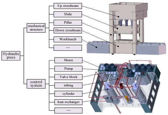 The mechanical structure of a press is typically composed of a simple rectangular frame, and large and medium presses with a heavy body often contain two or four pillars and three crossbeams. The mechanical structure of some small presses is simple and integrated. The frame is the physical support and safety protection structure of a press in the forming process. The slide is the moving structure used for general-purpose forming work, which is driven by the execution unit in the control system. The slide guide system is used to avoid tilting of the slide during the operation of equipment [16]. The control system is composed of energy transfer and conversion units, an execution unit, and an operating device, which provide power for the press operations. During metal forming, the press provides a large pressure. Combined with the size of its actuator, the output force of the press would be very high. In particular, the hydraulic press could export very high forming force, which has been widely used in the manufacturing of large parts. Figure 1 shows the structural composition of a hydraulic press, and other types of presses have a similar composition as the hydraulic press.