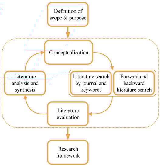 The review methods used in this research are shown in Figure 5, which is the guideline for this literature review. After defining the scope and purpose of this research, the review process could be divided into four main steps. First, the research theme or question should be specified, which could be described as a conceptualization stage. In this study, the main question is how to reduce energy consumption and improve energy efficiency in the metal forming process, which also involves the forming equipment and manufacturing system used. In addition, related environmental problems, such as carbon emissions, are also caused by energy consumption. Therefore, the search keywords for this review could be summed up as shown in Table 3. Second, a high number of relevant literature data were obtained by using the keywords and appropriate search strategies. Third, the current topics and issues were refined after reading and analyzing the searched literature critically in the evaluation phase. In the last phase, the findings were synthesized. The research process of the review includes iterative and circular literature analysis and synthesis process.