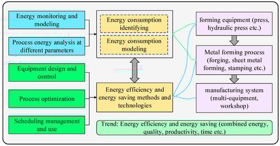 A methodological framework was derived from the previous hierarchical approach for the metal forming manufacturing system and the above research process of the review, providing an outline for the review. A descriptive flowchart for depicting the major steps of the proposed methodology is shown in Figure 6. In this research, the energy consumption analysis and energy models for metal forming equipment and process were first discussed to find the potential for energy reduction. Then, the methods and technologies for promoting the energy efficiency and saving from the aspects of design and control of metal forming equipment, process optimization, scheduling management, and use of the workshop were addressed in accordance with the proposed hierarchical approach. The detailed description of the flowchart is addressed as follows.