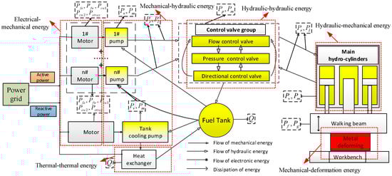 According to the characteristic features of energy conversions within the hydraulic press in working processes, the energy consumption could be decomposed into six energy elements as shown in Table 4, which are performed by their corresponding components, as shown in Figure 7. Moreover, based on the energy dissipation features of the components, the energy consumption models of the main energy conversion components or units have been established, such as the motors and pumps [24,25], which means the energy characteristics of energy elements were quantified.