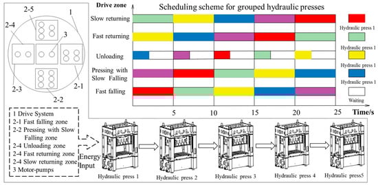 Configuration of grouped hydraulic presses and scheduling in the method (Reproduced with permission from Li, L., et al., J. Clean. Prod.; published by Elsevier, 2016) [7].