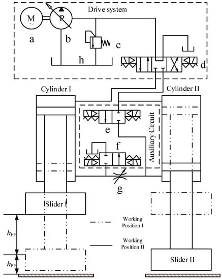 Therefore, some regeneration methods were proposed to solve the energy loss problem. A hydraulic accumulator was applied to recover the kinetic energy, and a flywheel was used to store the inertia energy [64,65]. An ultra-capacitor can be used to improve the sluggish dynamic response [66,67]. The harvested potential energy of the perpendicularly moving load can be reused by the hydraulic drive systems when needed [68,69,70,71]. However, these regeneration approaches have two drawbacks. One is that the configurations of the equipment are more complicated for the conversion units installed. The other is the low energy efficiency of energy regeneration processes, including recovery and reuse. In consideration of these defects, an improved energy matching method for two combined hydraulic presses was proposed to utilize the potential energy. The drive system is shared by the two presses in different times to reduce the energy loss caused by the slide return operations, so that the energy efficiency of the drive system is improved [63,72]. Furthermore, this method derived a more energy-efficient system with a double-actuator in a hydraulic press to reduce the potential energy as shown in Figure 9. Compared with the current hydraulic press that undergoes services, the developed system exerts obvious energy-saving effect [73].