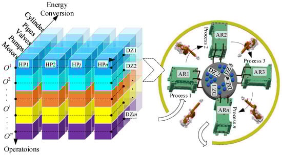 Using the energy flow of the units in each press, Li et al. proposed an improved scheduling approach to balance the makespan and the energy consumption [139]. In this approach, the physical structure and drive system of the press in a production line are separated. Then, the physical structures named actuators are grouped to share a redesigned drive system by a valve matrix. The drive system consists of several motor-pumps that can supply energy to each actuator individually, whereas the valve matrix is composed of several on–off valves. The motor-pump can drive an actuator on the condition that the corresponding valve in the valve matrix is open. The configuration of the improved scheduling system is shown in Figure 10. The status of the matrix and the configuration of the drive system depend on the scheduling of the system. Based on this configuration, formulations of energy consumption and the makespan in the multi-press system were obtained by employing the energy flow of the energy conversion units at the single press level. This scheduling model considers two objectives, i.e., energy consumption and makespan can be solved by changing the configuration of the drive system. Finally, the optimal solution that can minimize these two objectives can be output.