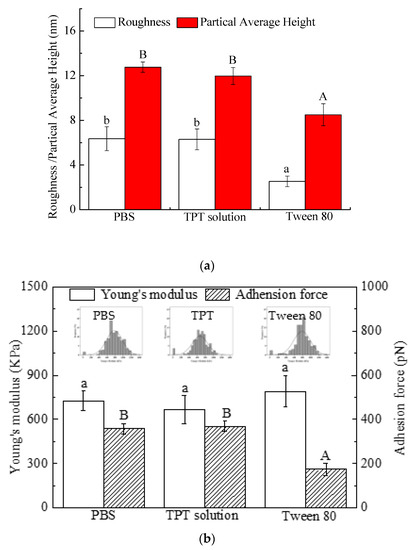 Figure 1 shows that the cells quickly recognized different media. The roughness of the cell surface after contact with PBS, TPT solution, and Tween 80 solution in the rapid contact process was 6.35 ± 1.07, 6.29 ± 0.93, and 2.53 ± 0.48 nm, respectively, and the average particle height was 12.76 ± 0.46, 11.97 ± 0.76, and 8.50 ± 0.98 nm. After the quick contact process with Tween 80, the adhesion force of the cells was significantly lower than that of the cells exposed to the control (PBS), and the Young’s modulus of the former was increased (Figure 1b). However, there was no significant difference in adhesion force and Young’s modulus between cells exposed to the PBS and TPT solution (Figure 1b). These results indicate that changes in cell surface properties after recognition of pollutants are related to the contaminant’s properties. Owing to the solubilization of Tween 80, hydrophobic organic compounds are dissolved, and more molecule metabolites on the cell surface are transferred to the solution, thereby reducing the surface adhesion force of the cells. Consequently, the cell surface roughness and average particle height decreases, and the surface of the cells in contact with Tween 80 becomes relatively smooth (Figure S1d). However, 1 L of water dissolve only 0.14 mg TPT at 25 °C [9], and the cell cannot recognize TPT in a very short time; thus, there was no significant difference between the PBS and TPT solutions.