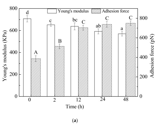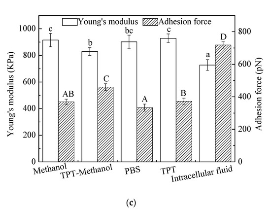 The separated cells were added to 20 mL of the MSM at the final cell concentration of 1 g·L−1. After shaking, 0.1 mL of the sample was pipetted through a disposable syringe over a 0.22 µm polyether sulfone filter followed by successively washing with sterile phosphate-buffered saline (PBS), 2.597 × 10−3 mol·L−1 TPT solution, and 50 mg·L−1 of Tween 80 solution three times to characterize the cells’ quick recognition process of these media. The filter membrane was removed, and the bacteria were allowed to attach to gel-modified mica and naturally air-dry [22]. Using PBS as the liquid medium, the Young’s modulus and the surface adhesion force of the samples were quantitatively determined by atomic force microscope (AFM). In addition, part of the suspension after shaking was ultrasonically disrupted in an ice bath using an ultrasonic cell pulverizer (the working time was 6 s, the interval time was 9 s, the total time was 30 min, and the ultrasonic power was 450 W), and the sample was crushed at 25 °C, centrifuged at 12,000× g for 5 min, and the supernatant was taken as the cytoplasm (intracellular fluid). In addition, the cells were collected and dried according to the steps followed for characterizing the rapid recognition process. After the cells on the gel-modified mica chip were naturally dried, PBS (control), cytoplasm, 1% methanol solution, 2.597 × 10−3 mol·L−1 TPT solution, or 2.597 × 10−3 mol·L−1 TPT/1% methanol solution were added as the liquid medium, and Young’s modulus and surface adhesion force were measured by AFM to characterize the cell’s conventional recognition of different substances (about 12 min).