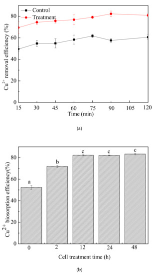 Meanwhile, B. thuringiensis cells were harvested from the TPT and MSM system after 12 h to reveal the effect of the adsorption time on the amount of Cu2+ adsorbed by the cells. The experimental adsorption times for 10 μmol·L−1 Cu2+ and 1 g·L−1 cells were 15, 30, 45, 60, 75, 90, 105, and 120 min.