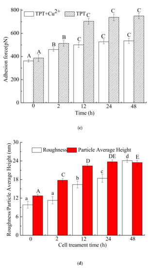 The ability of TPT-treated cells to adsorb Cu2+ was greatly enhanced (Figure 4a), and the removal efficiency reached 80% after 2 h, which is significantly higher than that of the control group (60%). B. thuringiensis cells have surface chemical functional groups, such as amino, carboxyl, hydroxyl, and carbonyl groups, which can carry negative charges [27]. Thus, Cu2+, with a high affinity and positive charge, is rapidly attracted to the cell surface [28]. It can be inferred that the increase in Cu2+ adsorption is associated with the increase in viscous substances on the cell surface. Cu2+ biosorption by cells treated with TPT for different times also supports this interpretation (Figure 4b). Cu2+ biosorption rose with the TPT treatment time within 12 h and became relatively stable after 12 h. Moreover, Cu2+ biosorption (Figure 4b) consistently improved with the increase in adhesion force (Figure 4c). It has been demonstrated [29] that viscous substances on the cell surface can increase the hydrophobicity of cells, while the hydrophobic behavior of cells enhances the adsorption of Cu2+ because of its positive charge. The adhesion force of cells treated with TPT and Cu2+ was significantly lower compared with cells not exposed to Cu2+ (Figure 4c). The removal efficiency of Cu2+ (Figure 4a) was positively correlated with the surface adhesion force (Figure 3a) (r = 0.966, P = 0.01; Table S2), which suggests that the enhancement of Cu2+ biosorption was due to the increase in cell surface viscosity. The cell surface roughness and average particle height of cells after Cu2+ adsorption were also increased (Figure 4d), further supporting the above inference.