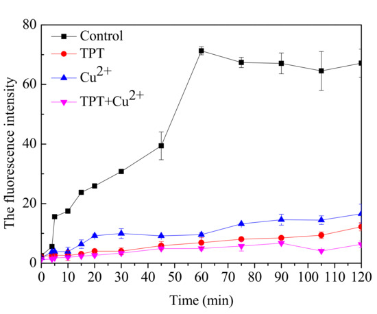 Generally, most DCFH-DA molecules can pass through the cell membrane freely by free diffusion in 20 min. In this study, the intracellular fluorescence of the control group increased sharply with the prolongation of time to 60 min, which indicates that DCFH-DA entered the cell gradually. The cell number, cell surface structure, and cell membrane permeability had an effect on the change in fluorescence intensity. From the fluorescence intensity change for the Cu2+ adsorption treatment group, we can conclude that the cell number had little effect on the change in fluorescence intensity. Previous research has reported that TPT can increase the cell membrane permeability of B. thuringiensis [30]. In this study, according to the change in fluorescence intensity in the Cu2+, TPT, and TPT+Cu2+ groups, it can be deduced that the changes in cell surface structure were the main reason for fluorescence intensity changes. The adsorbed layer on the cell surface might form a barrier and block other material from entering the cell interior. Obviously, the barrier caused by TPT was stronger than that caused by Cu2+, indicating that the intercellular secretion induced by TPT was the more effective shell. The change in the surface morphology of cells treated by TPT+Cu2+ also supports this inference (Figure S4). Bacteria in a biofilm state are more resistant to harmful conditions and substances, such as adverse growth environments and antibiotics, compared with bacteria in a free state [31]. After contact with TPT, the cells secreted viscous substances on the cell surface to form a biofilm, which prevented DCFH-DA from entering the cells. This was especially the case for the cells that adsorbed Cu2+; in these cells, a shielding layer was formed, which further hindered DCFH-DA from nearing the cell surface. In this treatment, the toxicity of the combined pollution of Cu2+ and TPT was less than that which would result from an additive response of individual Cu2+ and TPT treatments.