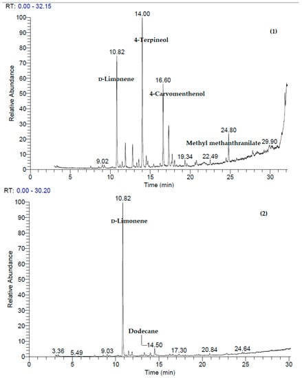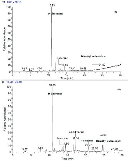 The GC–MS chromatograms of the identified compounds of EOs from the studied different parts of C. aurantium are shown in Figure 1.