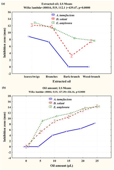 The main effects of oils from different parts of C. aurantium (a) and their amounts (b) on the growth of A. tumefaciens, D. solani, and E. amylovora.