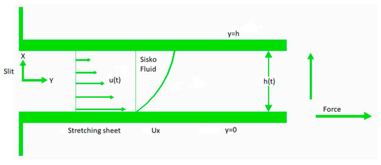 Consider a time depending and electric conducting the flow of thin layer of the Sisko fluid with impact of thermal radiations during spreading surface where x-axis is in parallel to the slot where y-axis shown in the figure is orthogonal to the surface as given below in Figure 1.