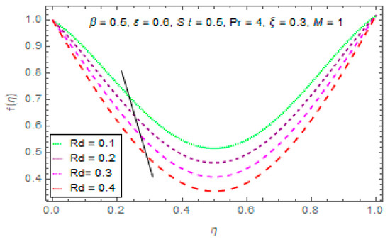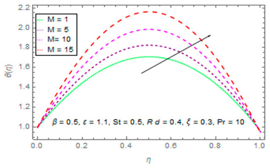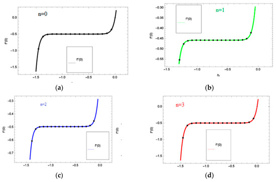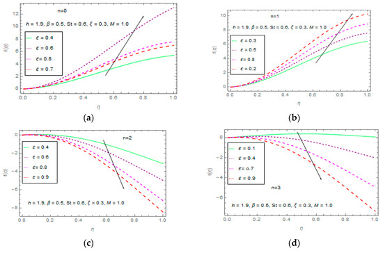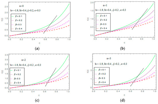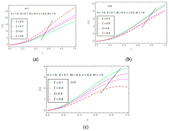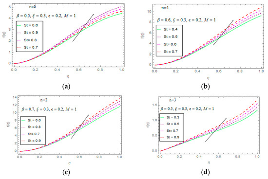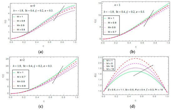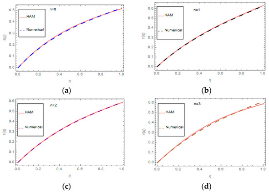 The current work investigates the MHD and radiative flow of Sisko thin film flow having unsteady stretching sheet. The purpose of the subsection is to inspect the physical outcomes of dissimilar implanting on the velocity distributions and temperature distribution which are described in Figure 3, Figure 4, Figure 5, Figure 6, Figure 7, Figure 8, Figure 9, Figure 10, Figure 11 and Figure 12. Figure 3a–d shows the influence of unsteady constraint on the velocity profile for dissimilar values of power index and Increasing increase the velocity field It is clear that varying power indices x having similar response to the time dependent parameter, that is the increase value of the power index rise the velocity distribution. The impact of the unsteadiness parameter on the heat profile is shown in Figure 4. It is observed that directly proportional to . augmented rises the temperature, which in turn rises the kinetic energy of the fluid, so the fluid motion increased. It is perceived that the effect of for the different value of power index and having a similar effect on heat profile Figure 5a–d demonstrate the effect of the film thickness for dissimilar values of power index and . It is perceived that the velocity profile falling down with higher values. Figure 6a–d describe the characteristics for for changed values of power index and . When increase on the surface of the sheet during the flow, the flow rate falls, which in results decrease the velocity profiles. This significance of on velocity field is due to the rise in the progresses the friction force of the movement, which is called the Lorentz force. It is the fact that fluid velocity reduce in the boundary layer sheet. Figure 7 demonstrates the effect of film thickness on temperature profile. It is observed that the large values of film thickness rise the temperature, and actually the higher value of speed up the molecular motion of the liquids which in turn increases the internal energy and the temperature increase. The effect of stretching parameter for each changed values of power index and on velocity profile is shown in Figure 8a–c. In case of , it is clear from Figure 8a that velocity profile increase for large value of stretching parameter . When values of power index are varied and the effect of stretching parameter become changed and for this effect is totally opposite that is the velocity field reduces. For the stretching parameter becomes zero. The effect of Sisko fluid parameter for each changed values of power index and on velocity profile is shown in Figure 9a–d. The large values of Sisko fluid parameter rise the fluid motion, but when the power index goes toward increase then this effect is seen changed and in case of the velocity field reduces (Figure 9d). The impact of on is shown in Figure 10. Both temperature and concentration distributions vary in reverse form with . When the . number increasing it decrease the temperature distribution, and when the number decreases it increases the temperature distribution. Same effect of on concentration distribution is shown in (32). For increasing values of power index and thermal radiation increases rapidly. The effect of (thermal radiation parameter) on is presented in Figure 11. When the heat transmission coefficient is minor, then the thermal radiation plays an important role in the heat transfer of comprehensive surface. By increasing thermal radiation parameter , its show that it augments the temperature in the fluid film. Due to this rising the rate of cooling is going down. For increasing values of power index and thermal radiation increases rapidly. The HAM and numerical comparison has been displayed in in Figure 12a–d. Excellent agreement is found between HAM and numerical method.