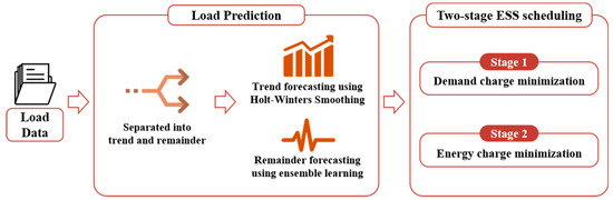 Our work has a focus on use of a statistical model with Holt–Winters smoothing and ensemble learning. Based on this prediction including peaks, two-stage ESS operation is planned to reduce the cost using peak control and arbitrage trading, as shown Figure 1.