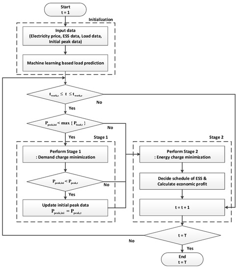 To use the 2-stage algorithm, it receives input data (electricity price, ESS information, load data, initial peak load) and makes predicted load data based on machine learning. Specifically, the loads used in this paper are fixed loads and load scheduling is not considered. the algorithm is operated between working time, i.e., t = . Upon setting these parameters, peak of the predicted load is compared with the initial peak load. If the peak of the predicted load is greater than the initial peak load, perform stage 1 and stage 2 sequentially; otherwise, perform only stage 2. This process repeats until t = T. T means the number of time steps for which electricity charges are set.