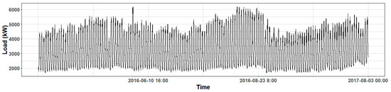 Fifteen-minute interval load data was used to obtain the predicted load data learned by machine learning techniques. This load data was used during the summer (June–August) at Inha University in Incheon, South Korea from July 2015–August 2017. We removed weekends and holidays to increase the prediction accuracy because they have different consumption behaviors compared to weekdays. We used 20 days (3–31 August 2017) at the end of the load data as the test data while the rest were used as the training data. Figure 3 shows the training data used to predict the future load.