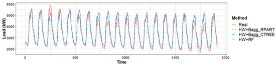 We conducted load prediction using ensemble learning and Holt–Winters smoothing. It is widely agreed that the best approach is to estimate the load by employing bagging which uses CTREE as the base model (Model 2). It is a generally known fact that random forests are better than bagging. Therefore, this result seems to be the result of the difference in the base model. Using CTREE model as a base model in a random forest may lead to better results than this. Additionally, the load is a variable that is highly influenced by the environment. Using weather variables such as temperature and humidity and other specific variables relating to the load can be used to obtain a better model. This is a more in-depth issue to be considered in a study on load prediction.